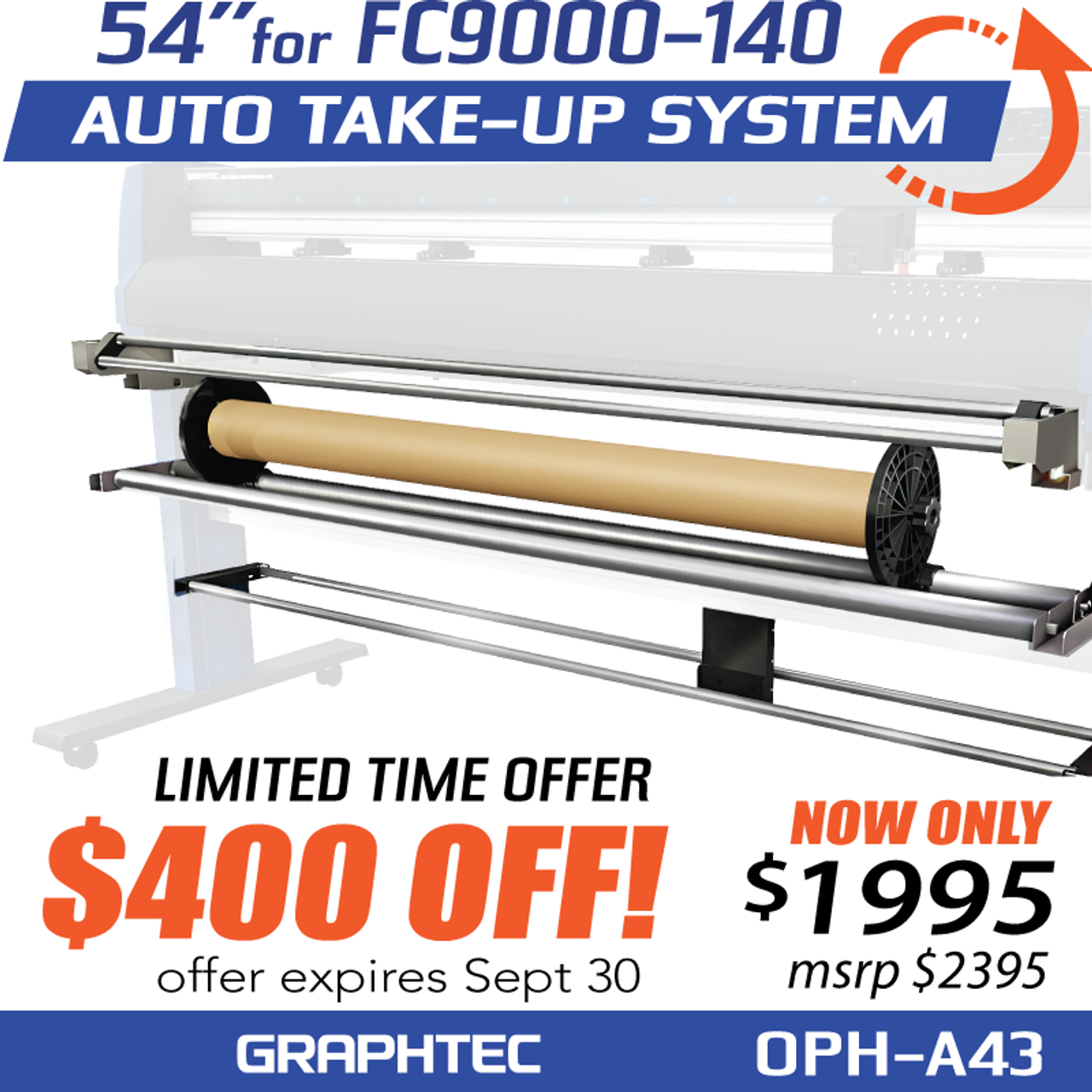 Graphtec Automatic Take-up Roller for media feeding increases speed and improves accuracy. No need to take up the long length media by hand anymore!