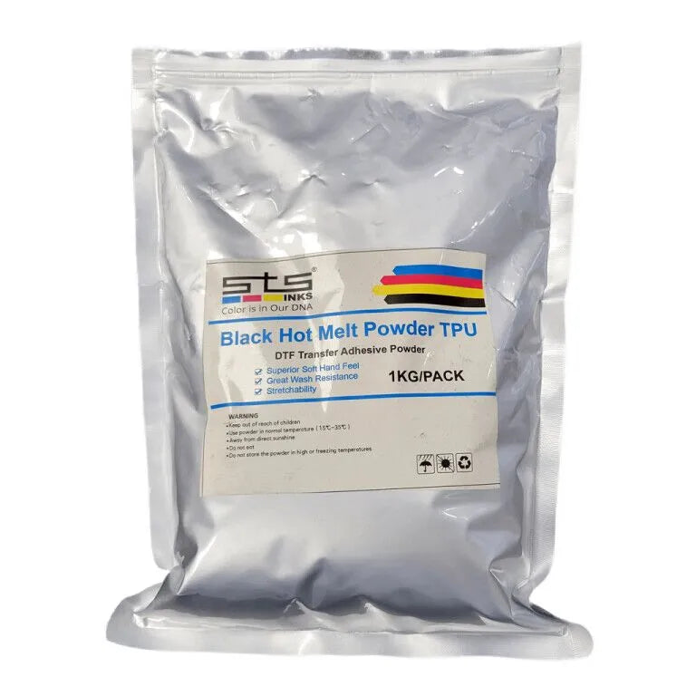 Polyurethane hot-melt adhesive powder has excellent bonding and flexibility properties with STS DTF inks. It has a softening point of 70-80 um (particle size). Transfer time is 15-20 seconds at 300-325 F with low melting point (225 degrees F), sold in 1-gallon bottles (2.02kg).